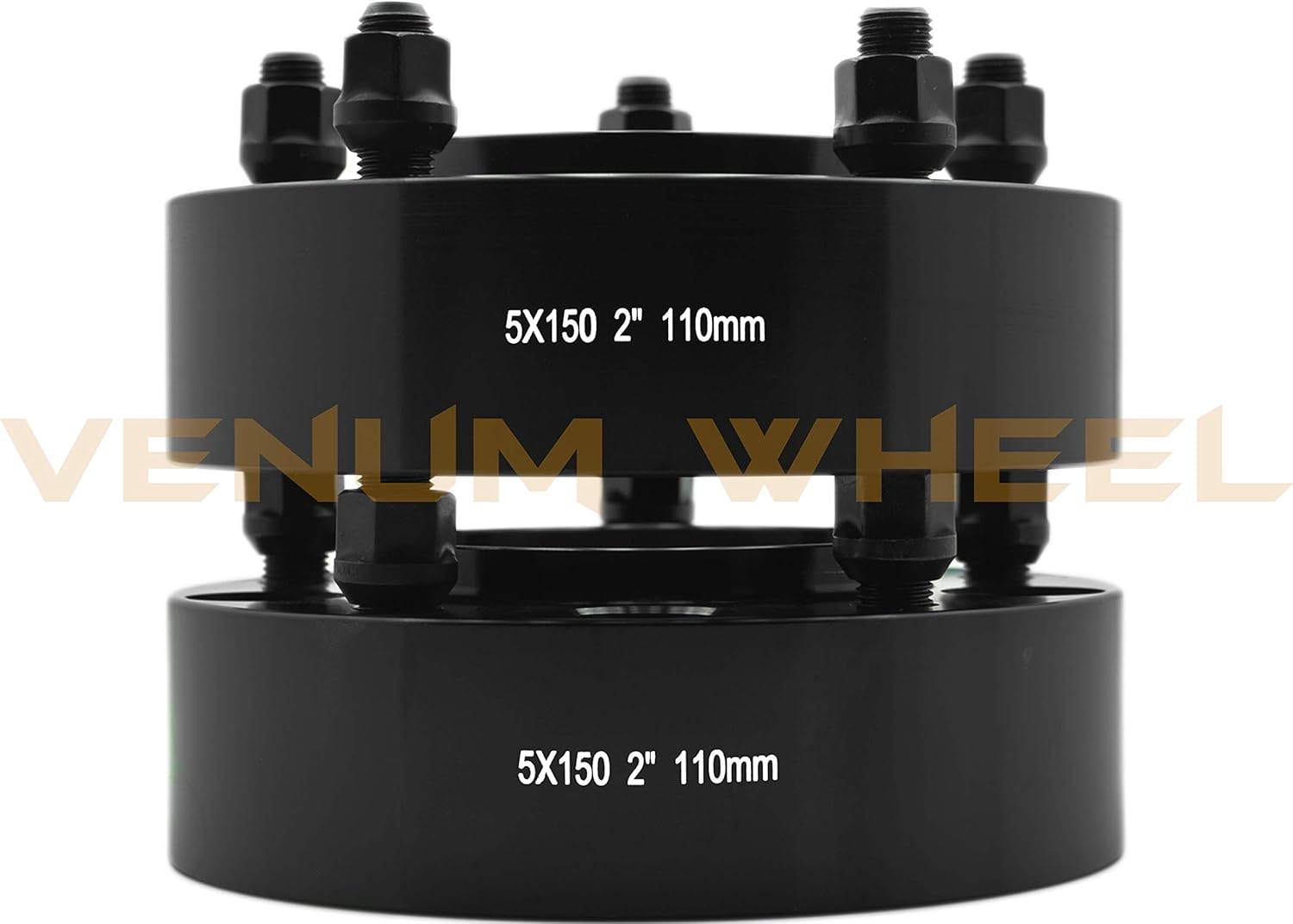 [ PRODUCT DESCRIPTION ] These Black Hub Centric Wheel Spacers are precision engineered for 5 Lug trucks allowing to widen your tire track by 2" on each side, improving the look of your vehicle and accommodating for wider custom wheels. Venum Wheel Accessory products are developed and rigorously tested by ASE certified specialists, in conjunction with many local offroad shops. Aerospace 6061 T-6 aluminum is widely known for strength and light weight, this premium material is guaranteed to withstand even the most extreme environments. We use 10.9 pressed in studs. Once our spacers are properly installed, they stay installed without the risk of vibrations or imbalance. This kit includes all necessary hardware for installation. [ KIT INCLUDES ] - 4 Pc Hub Centric Adapters - 20 Pc Spike Lug Nuts 4.5" Tall (9 Series) + 1 Key - 1 Free Thread Locker [ WORKS WITH ] 1998-2007 Lexus LX470 2008-2016 Lexus LX570 1998-2019 Toyota Land Cruiser 2007-2019 Toyota Sequoia 2007-2019 Toyota Tundra [ IMPORTANT NOTES ] Installation Instructions Included -Please read the installation instructions before attempting to install the adapters. Professional installation recommended -We recommend getting these adapters installed by a trained professional, but it is not necessary. Make sure you get 5-7 turns before tightening -Must be torqued down to FACTORY SPECS. Vehicles studs cannot pass the face of the adapter -If the studs do pass the face of the adapter, you will need to grind/cut them shorter. Only applies to 1.25" or smaller adapters.310 763 0028
