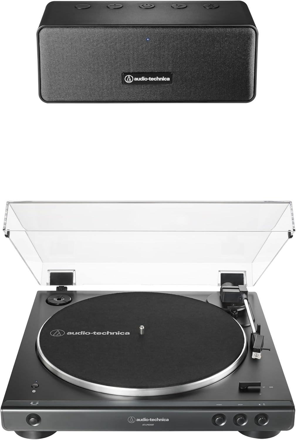 The ATLP60XBTBK Bluetooth Turntable Speaker Pack includes the AT-SP65XBT portable wireless speaker and AT-LP60XBT bluetooth paired turntable. Cut the cord, keep the vinyl. The AT-LP60XBT gives you all the great features of the redesigned AT-LP60X fully automatic belt-drive stereo turntable with the added convenience of Bluetooth wireless connectivity. So you can set up your turntable in one room and listen to it in another without having to run a bunch of cables. The turntable pairs with speakers, headphones or other wireless devices. With its CSR BT chipset, the turntable is even able to connect to devices that support the aptX codec, which offers much-improved sound quality over the standard SBC codec. Of course, the AT-LP60XBT can also be operated just like a regular turntable with a traditional wired connection. Either way – wired or wireless – you get outstanding audio with the ease of automatic operation controlled by front-panel start, stop and tonearm lift buttons. The AT-SP65XBT portable wireless speaker is 10.6" wide, 4.1" high, and 4.5" deep, and is equipped with two 3" full-range drivers and a passive radiator to deliver clear, powerful audio with enhanced bass. The speaker housing is constructed of a durable injection-modeled polymer and is outfitted with an elegant fabric grille. Power, play/pause, volume, and hands-free calling buttons are located on the top of the speaker for easy access, with the built-in mic (for making calls via a paired smartphone) conveniently located on the front of the speaker next to the power LED. A 3.5 mm (1/8") jack is available on the back of the speaker, allowing you to listen to audio from a wired device. The speaker’s internal battery supplies 12 hours of continuous playback and can be recharged from the USB-C port while using the included 61 cm (2') USB charging cable. The speaker also comes with a 3.5 mm (1/8") to 3.5 mm (1/8") auxiliary audio cable.