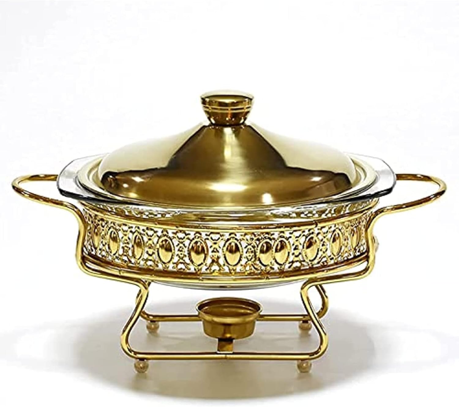 Features: This buffet heater set has a wide range of uses and is very suitable for large gatherings,events,buffets,hotel breakfast areas,brunch,catering,parties,weddings and cafeterias,etc.,and can meet all your needs. This premium chafing dish set has a single mini size and a fast cooking seal design,which is great value for money. The lid of the pot is completely closed to prevent the soup from splashing out.The toughness of the design is very safe and it can keep the food delicious. Specification: Name: Round glass dining stove Material: iron frame + glass plate Weight: 1700g Color: silver,gold Specification: 2.0L Products include: 1*Stainless Steel Chafing Dish