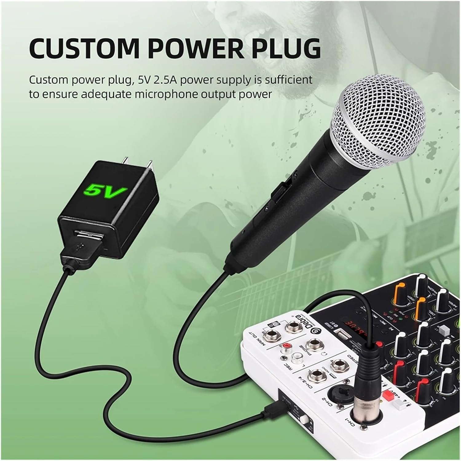 This mixer is a multi-purpose with a sound card 4Channel mixer,Can satisfy the user's family music production,Live webcast,KSong cover and other needsProduct characteristics:The mixer is equipped、Input Gain and High Bass Adjustment、Built-in 48V Phantom power supply is suitable for direct power supply of condenser microphone、High Definition Headset Output Port、MP3 Player、 reception、With connection PC Sound card。The mixer is small in size.、Lightweight,Can be directly connected PC The Port power supply,No additional power supply required,Can be through Connect the computer to supply power to run,The trouble of using an external adapter is saved.,You can also use mobile power or AC/DCThe adapter powers it.Product information:Model:V4.Color:Black and White.Packing list:*1, Power cord*1,Power cord plug*1,English instructions*1.Gross wieght:0.6KG.Bare metal size:160mm*180mm*48mm.Chip protection, overvoltage undervoltage overheat DC short circuit detection.