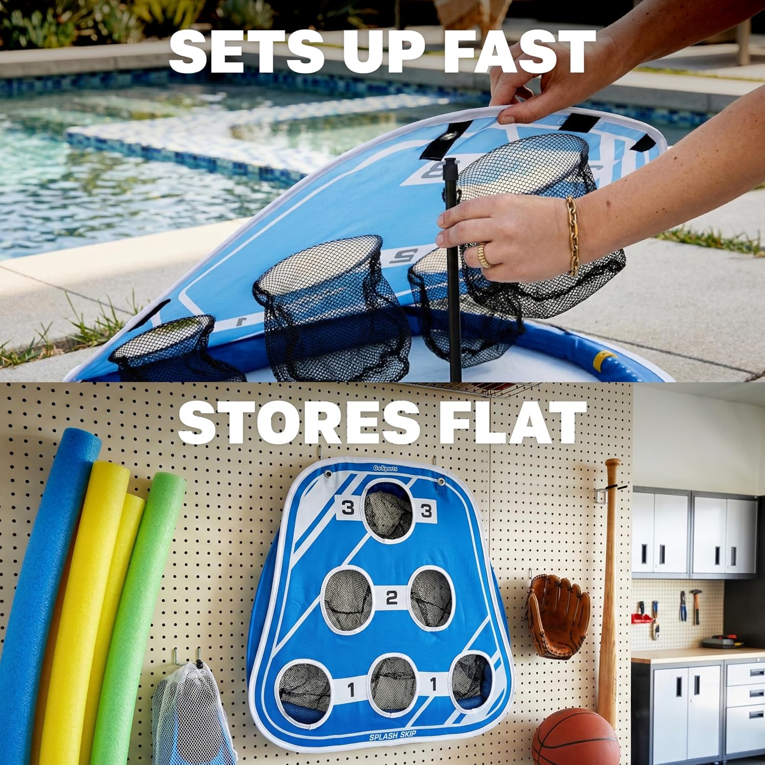 Combining the fun of skipping stones across the water and classic cornhole, Splash Skip is an action-packed water game anyone can play. Toss the foam stones across the water and into the scoring holes to reach 21 points first and win! This pool corn hole game is made from high-quality, all-weather materials for pool and lake games season after season. Instantly set up anywhere you have a safe, open stretch of water and room to play, such as pools, calm lakes and even slow-moving, shallow creeks. Optionally, play on land (grass, beaches, etc.) for traditional cornhole toss gameplay. Go head-to-head or compete in teams of 2 with friends and family. Splash Skip easy to learn and fun for all!