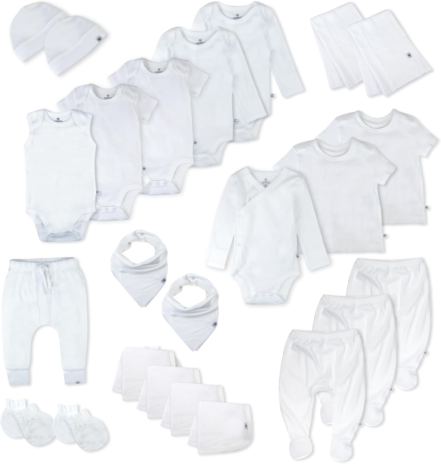 100% Organic Cotton Baby ClothesThe Honest Baby Clothing Over The Top 24-Piece baby gift set includes the Sleeveless Bodysuit, two Short Sleeve Bodysuits, two Long Sleeve Bodysuits, two Short Sleeve T-Shirts, the Long Sleeve Side-Snap Top, the Honest Pants, two Footed Harem Pants, two Beanies, three No-Scratch Mitts, two Bandana Bib Burp Cloths, two Tri-Fold Burp Cloths, and four Washcloths. Our baby essentials are made from machine washable, super soft 100% certified organic cotton and designed for easy changing and dressing. Perfect for wearing on their own or pairing together for a super cute look, these baby clothes and accessories are great for all year long. Your baby girl or baby boy is sure to look cute, comfy, and cozy! Plus, this gift set is packaged in an eco-friendly gift box, making it a great baby shower gift.