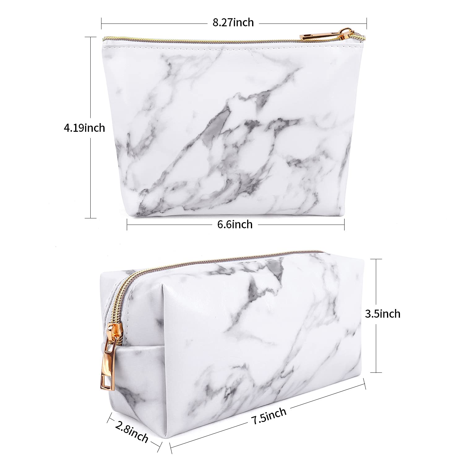 Multifunctional Makeup bags 【Easy to Clean】You can Clean it by Wipe with a Wet Tissue or a Damp Cloth 【Waterproof】Made of High-Quality PU Leather and Polyester, With Good Function of Waterproof 【Portable and Lightweight】Suitable for party, travel or for home use, You can bring it to anywhere you want 【Perfect For】Phone, Wallet, USB Cable, Lipstick, Nail kit, Makeup Brushes, Eyeshadow, Makeup Palettes, Shampoo or Skin Care products so on Specifications: Material: > Outside: PU leather with marble streak > Inside: polyester fiber Size: > Rectangle cosmetic bag: 7.5 x 3.5 x 2.8 inch > Dumpling cosmetic bag: 8.27 x 4.9 x 2.8 inch Color:Black Pattern: marble Quantity: 2 pieces Multifunctional Storage Bags This cosmetic travel bag not only can storage your cosmetics, but also Jewelry, Electronic Accessories, Essential oil, Toiletries, Shaving Kit, Valuable objects. Package included - 1 x Rectangle Cosmetic bag - 1 x Dumpling Cosmetic bag Notes > Cosmetic Accessories and Makeup Brushes are Not included. > If you find any issue with the product,we are always here to provide our best service for our customer.