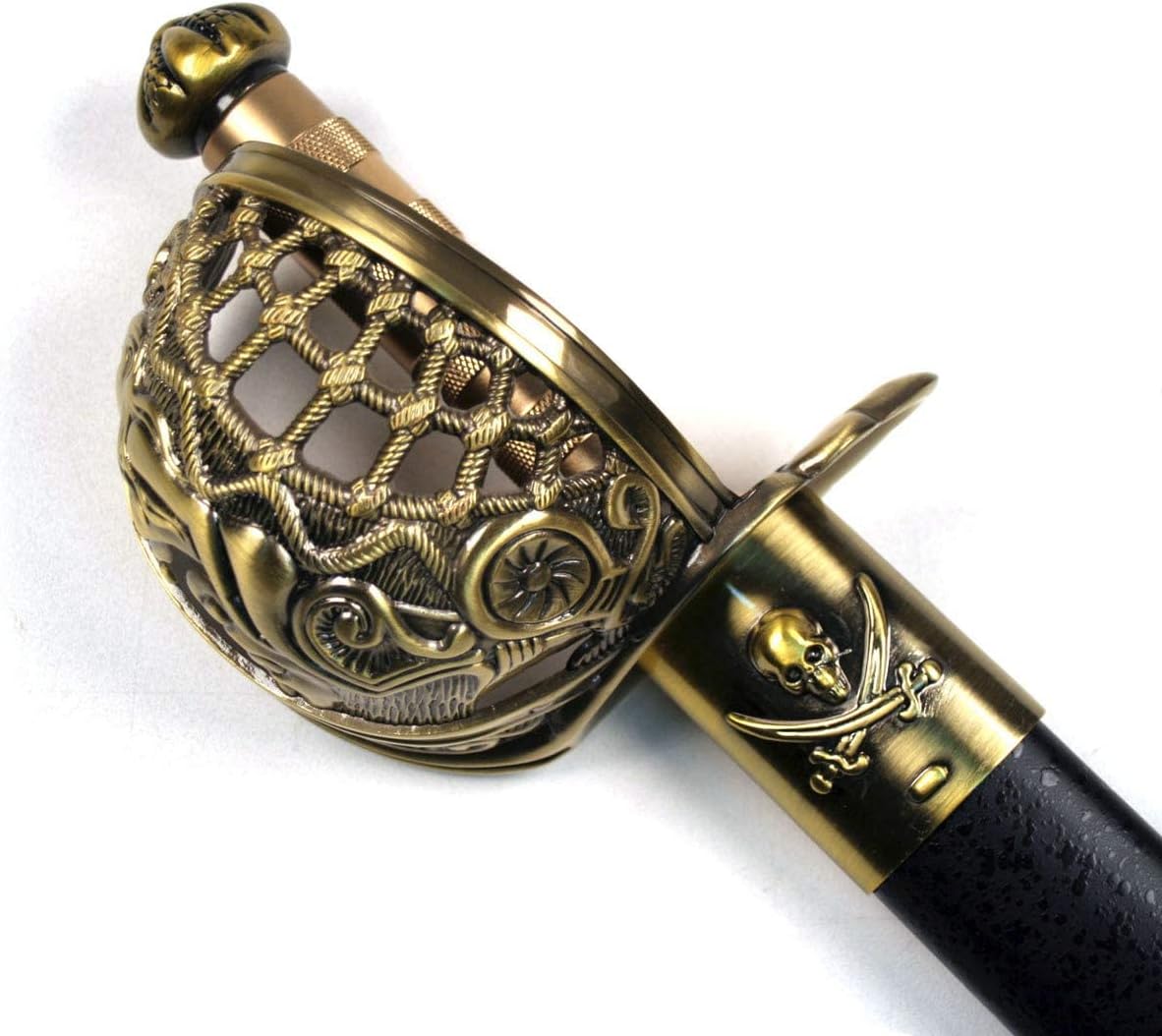 This pirate sword replica is a great sword to add to your collection, for cosplay, and for productions. The cutlass is best known as the pirate’s weapon of choice, the naval side arm, likely because it was robust enough to hack through heavy ropes, canvas, and wood. It was also short enough to use in relatively close quarters, such as during boarding actions, in the rigging, or below decks. Another advantage to the cutlass was its simplicity of use. The cutlass required less training than the rapier or small sword, and was more effective as a combat weapon than the full sized sword. This beautiful cutlass sword features a 440 stainless steel constructed blade. The blade is mirror polished. The pommel of the sword is an ornate capstan rivet. Comes with the sword is a wood constructed scabbard.