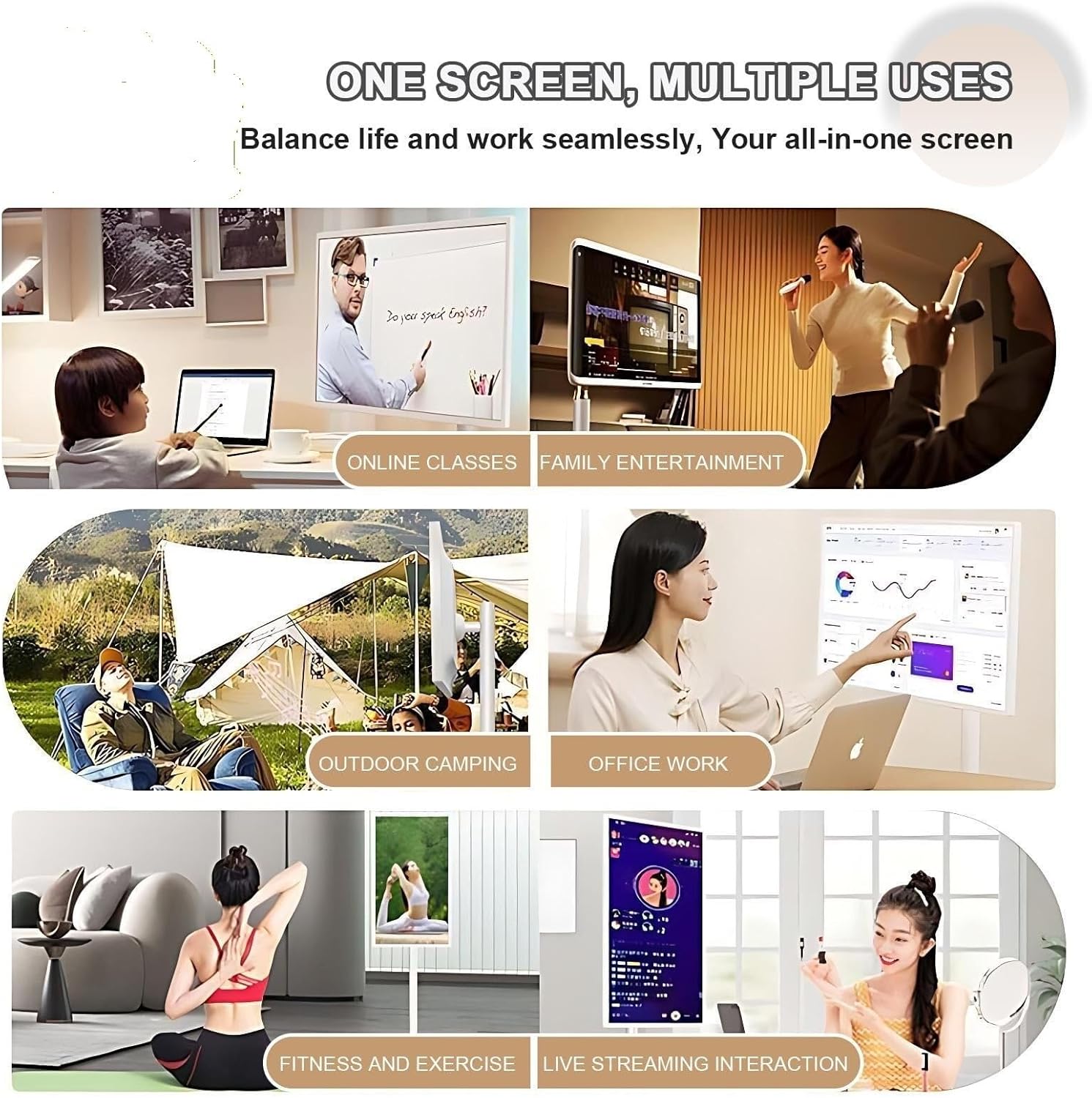 • 【Portable Smart TV with Wheels】This portable smart TV with wheels features quiet omnidirectional casters for smooth mobility at home, office, or outdoors. The portable smart TV includes a 7800mAh battery for up to 8 hours of cordless viewing—ideal for gatherings or on-the-go entertainment.