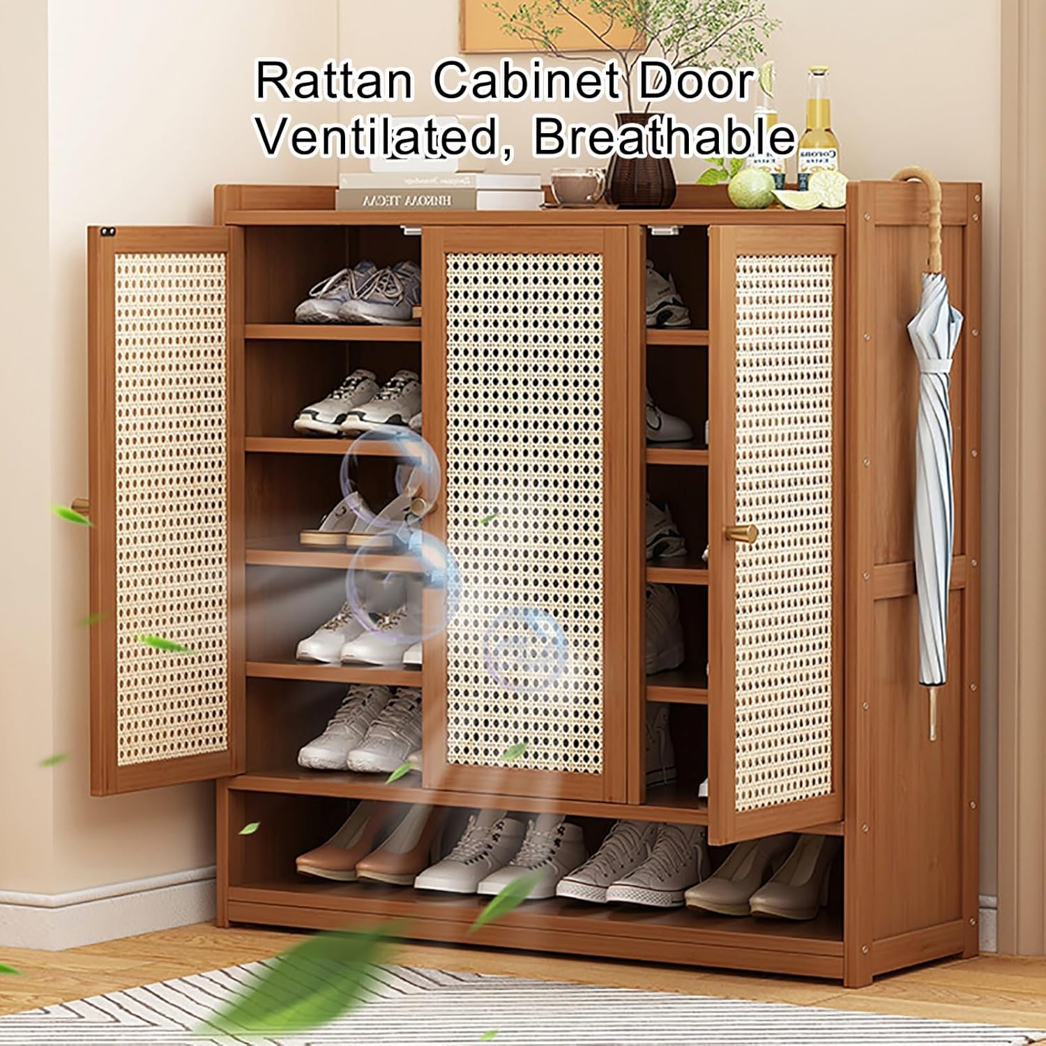 Discover the perfect space-saving shoe cabinet designed to elevate your home nization. Our tall, high-capacity shoe cabinet is an excellent choice for your entryway, hallway, closet, or living room, ensuring that your footwear stays neat and accessible. **Key Features:** 1. **Smooth Finish**: The finely polished surface protects against everyday wear and tear, maintaining a sleek look. 2. **Ample Depth**: With a depth of 32 cm, this cabinet accommodates larger shoes comfortably, making it versatile for various footwear styles. 3. **Elevated Base**: The raised bottom effectively prevents moisture, helping to keep your shoes dry and in excellent condition. 4. **Breathable Rattan Doors**: Designed for optimal ventilation, the rattan doors ensure your shoes stay fresh while providing a stylish touch. 5. **Eco-Friendly Bamboo Material**: Crafted from durable and stable bamboo, this cabinet is moisture-resistant and built to last. **Product Dimensions:** Choose from six sizes to best fit your space: - 2 Doors, 7 Layers: 60 cm (W) x 32 cm (D) x 94 cm (H) - Holds about 18 pairs of shoes. - 2 Doors, 8 Layers: 60 cm (W) x 32 cm (D) x 107 cm (H) - Holds about 21 pairs of shoes. - 3 Doors, 7 Layers: 90 cm (W) x 32 cm (D) x 94 cm (H) - Holds about 30 pairs of shoes. - 3 Doors, 8 Layers: 90 cm (W) x 32 cm (D) x 107 cm (H) - Holds about 35 pairs of shoes. - 4 Doors, 7 Layers: 120 cm (W) x 32 cm (D) x 94 cm (H) - Holds about 38 pairs of shoes. - 4 Doors, 8 Layers: 120 cm (W) x 32 cm (D) x 107 cm (H) - Holds about 42 pairs of shoes. **Assembly Required**: Yes, easy-to-follow instructions are included. **Package Includes**: 1 Shoe Cabinet, Accessory Pack, Assembly Instructions. Transform your space with our stylish and functional shoe cabinet, designed to meet your storage needs while enhancing your home’s aesthetic. Keep your shoes nized and easily accessible with this practical solution.