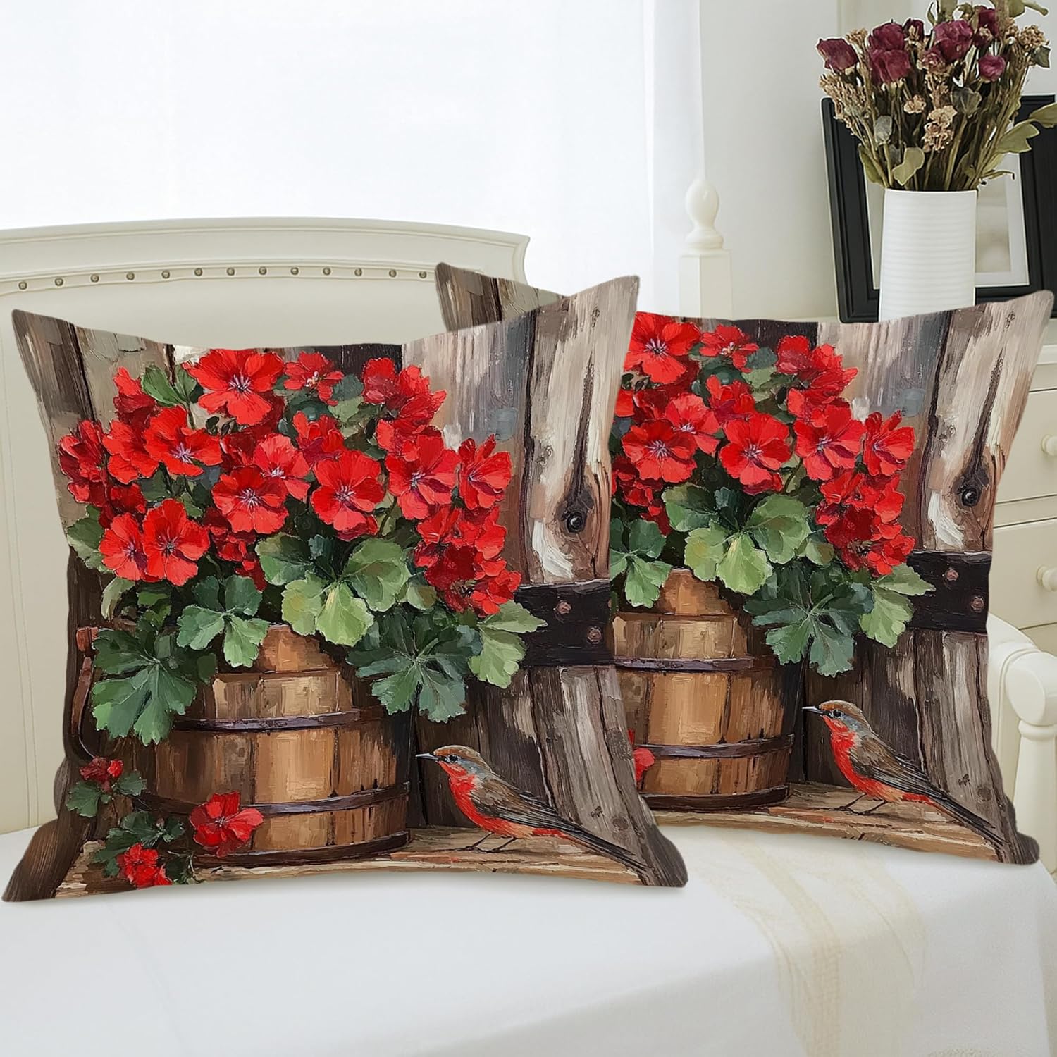 Spring Floral Throw Pillow Covers Set of 2, Red Geraniums Decorative Pillow Cases, Vibrant Outdoor Farmhouse Decor for Couch Sofa Bed 24x24 Inch